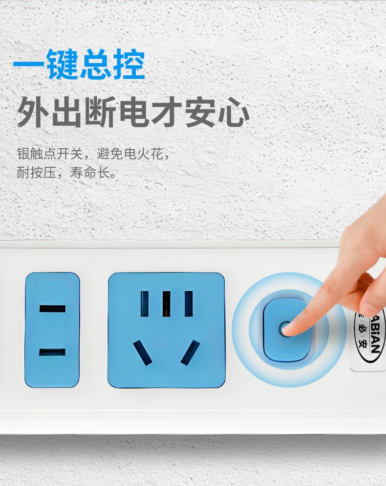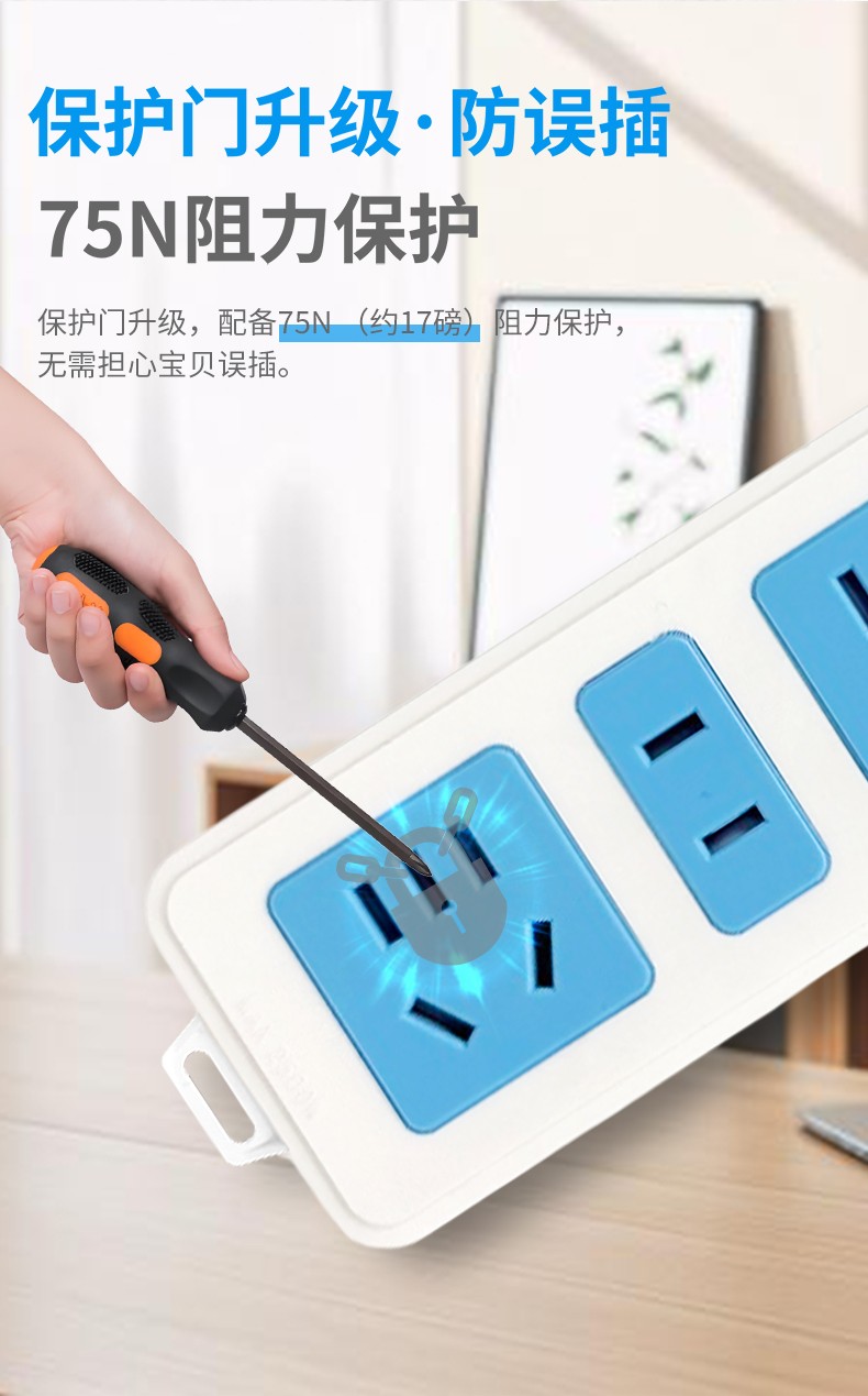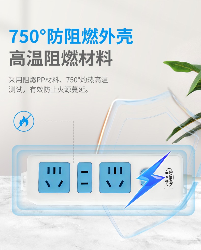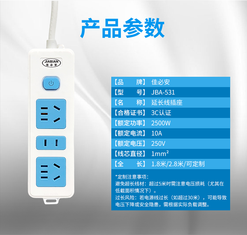 品牌:佳必安型号:JBA-531名称:延长线插座外壳材质:PP面板:白PP蓝PC保护门:尼龙插套固定件:PP指示灯:有开关:有安全门:有额定功率:2500W