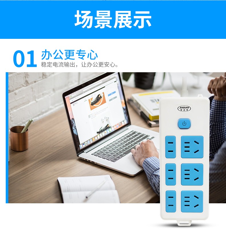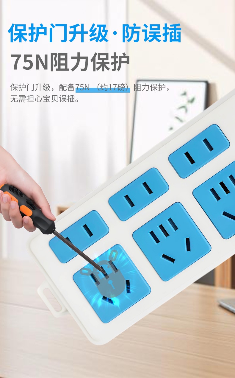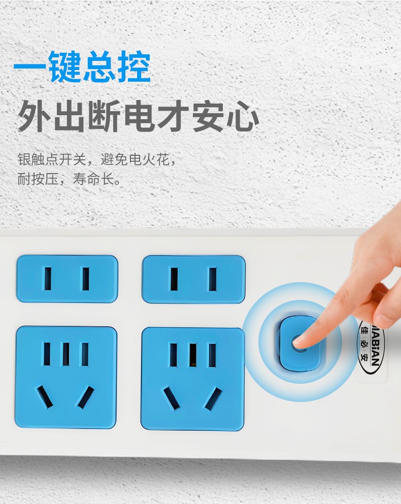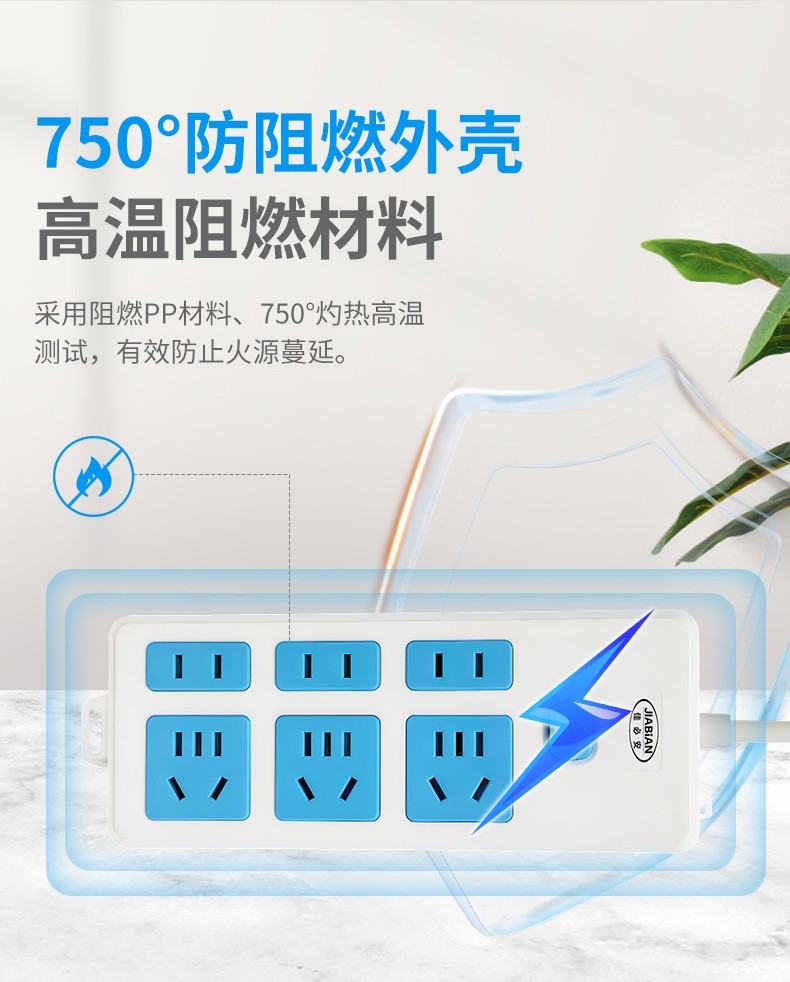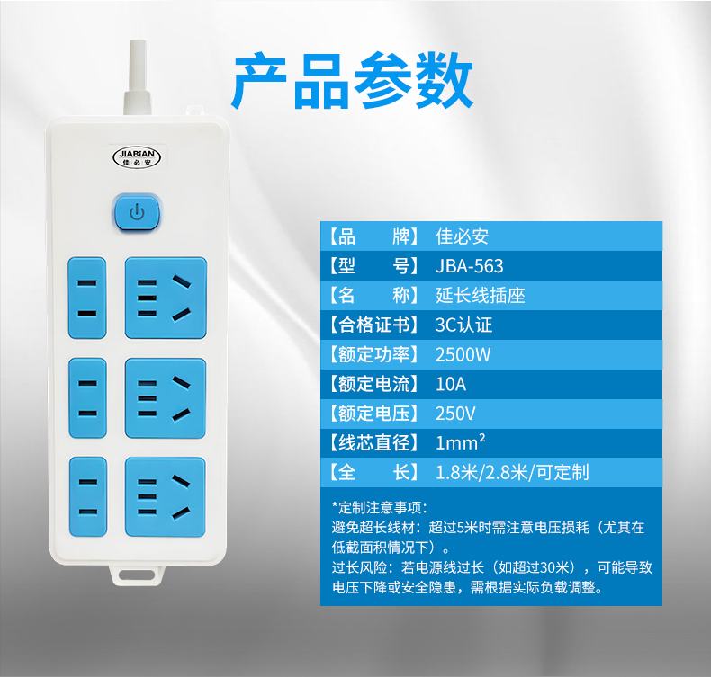 品牌:佳必安型号:JBA-563名称:延长线插座外壳材质:PP面板:白PP蓝PC保护门:尼龙插套固定件:PP指示灯:有开关:有安全门:有额定功率:2500W